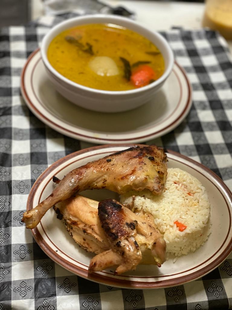 Sopa de gallina con vegetales al estilo chapin, servida con arroz y tortillas